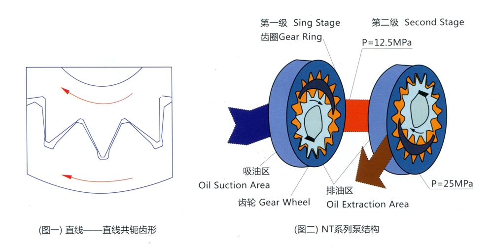 NT系列泵的工作原理同漸開線內(nèi)嚙合齒輪泵一樣,由齒輪帶動齒圈旋轉(zhuǎn),在旋轉(zhuǎn)過程中吸油腔容積由小變大產(chǎn)生真空而吸油,排油腔容積由大變小擠壓油液而排油。NT系列泵的最大優(yōu)點是采用直線共軛線的齒形(見圖一),并按無困油設(shè)計,從而大大降低了泵的噪音和壓力脈動,工作時壓力油使滑動元件得到強制潤滑,磨損極少,提高了泵的使用壽命。
